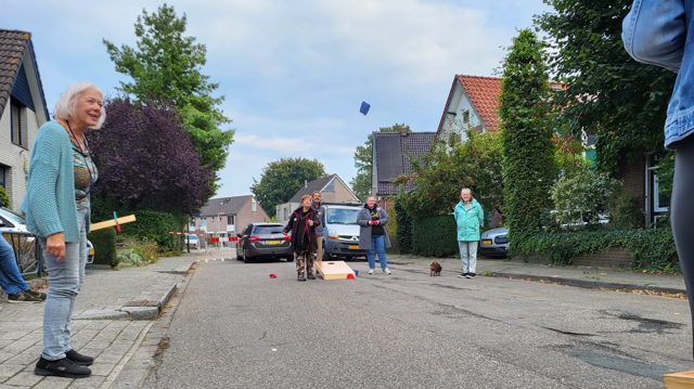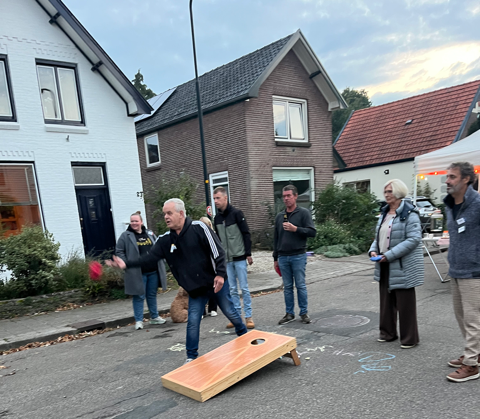 Terwijl de kinderen smulden van de door Gijs gemaakte pizza’s, gingen twee teams fanatiek het ‘pittenzak spel’ spelen, wat soms een hilarisch schouwspel was voor de andere teams. Daarna was het tijd om aan de feestelijk gedekte lange tafel plaats te nemen, waar ons door Gijs en Henriette van Buiten.studio een voortreffelijk 5-gangen diner met de heerlijkste met name groentegerechten van de barbecue werden geserveerd. Dank daarvoor. Na de koffie werd de pub-quiz gespeeld, waarbij je kennis van de historie van de eigen straat en de buurt, van bekende Apeldoorners, culinair – en cultureel Apeldoorn èn als laatste ronde de vragen over de buren werden getest per team. Het invullen van de antwoorden leidde soms tot grappige ‘verhitte’ discussies. De punten van beide spellen werden bij elkaar opgeteld en de winnaars kregen een prijsje uitgereikt. Spontaan meldden zich drie buren aan die het buurtfeest 2026 willen gaan organiseren. Het bleef nog heel lang gezellig bij het knapperend vuur van de terraskachels. Bedankt buren voor het helpen opzetten en afbreken van de tenten en het sjouwen. En voor het helpen afwassen tussen de gangen van het diner.