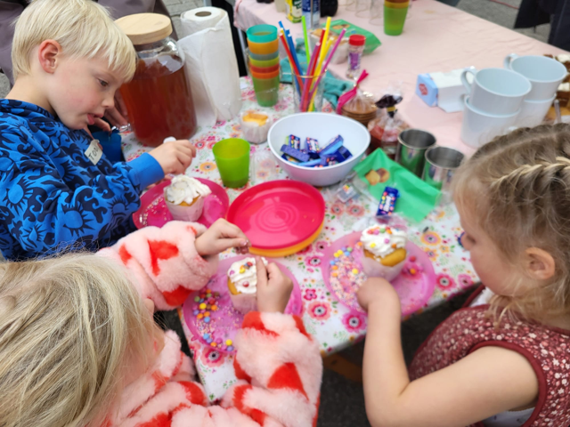 Laura had alles tot in de puntjes gecoördineerd. Om 15:30 uur stond de koffie en de thee klaar en konden de buren kennis maken en bijkletsen met elkaar. De kinderen deden zich tegoed aan het versieren en eten van hun zelf versierde cupcake. Omdat er nogal wat verjonging in de straat was komen wonen, kreeg een ieder een naamkaartje, met een kleuraanduiding. De kleur bepaalde in welk team je was ingedeeld voor de activiteiten. Iedereen moest een aantal vragen over zichzelf invullen, die later werden verwerkt in de pub-quiz.